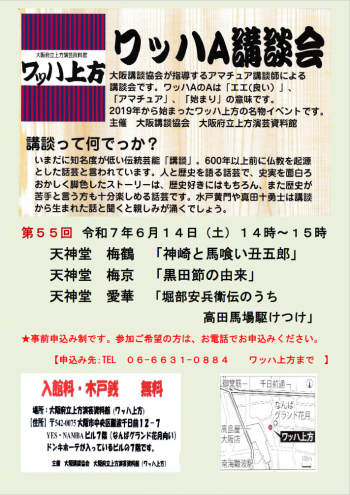 大阪講談協会が指導するアマチュア講談師が出演する「ワッハA講談会」開催のお知らせです。