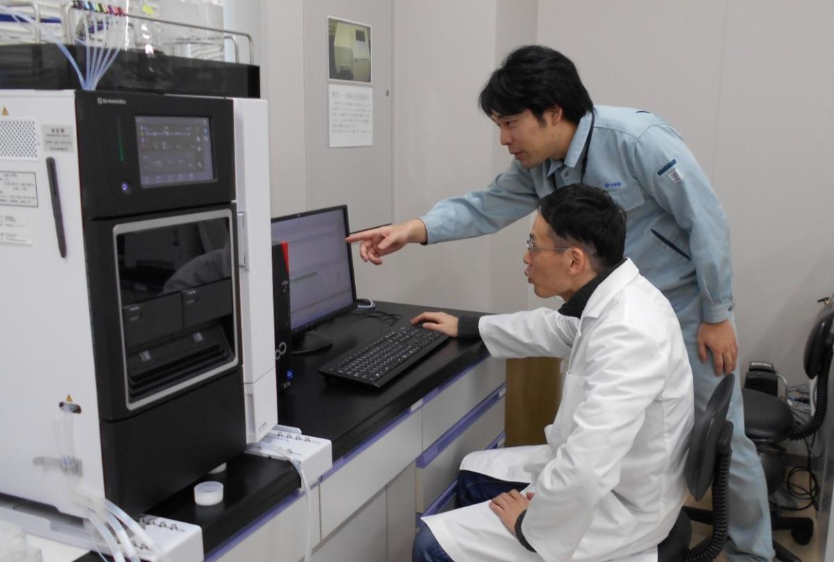近年では、分析技術も機械化が進んでいます。調べたいものを液体にして測定機に注入する液体クロマトグラフィーや原子吸光光度計などを使用し、調べたい成分の量を、より精密に効率よく分析できるよう行います。