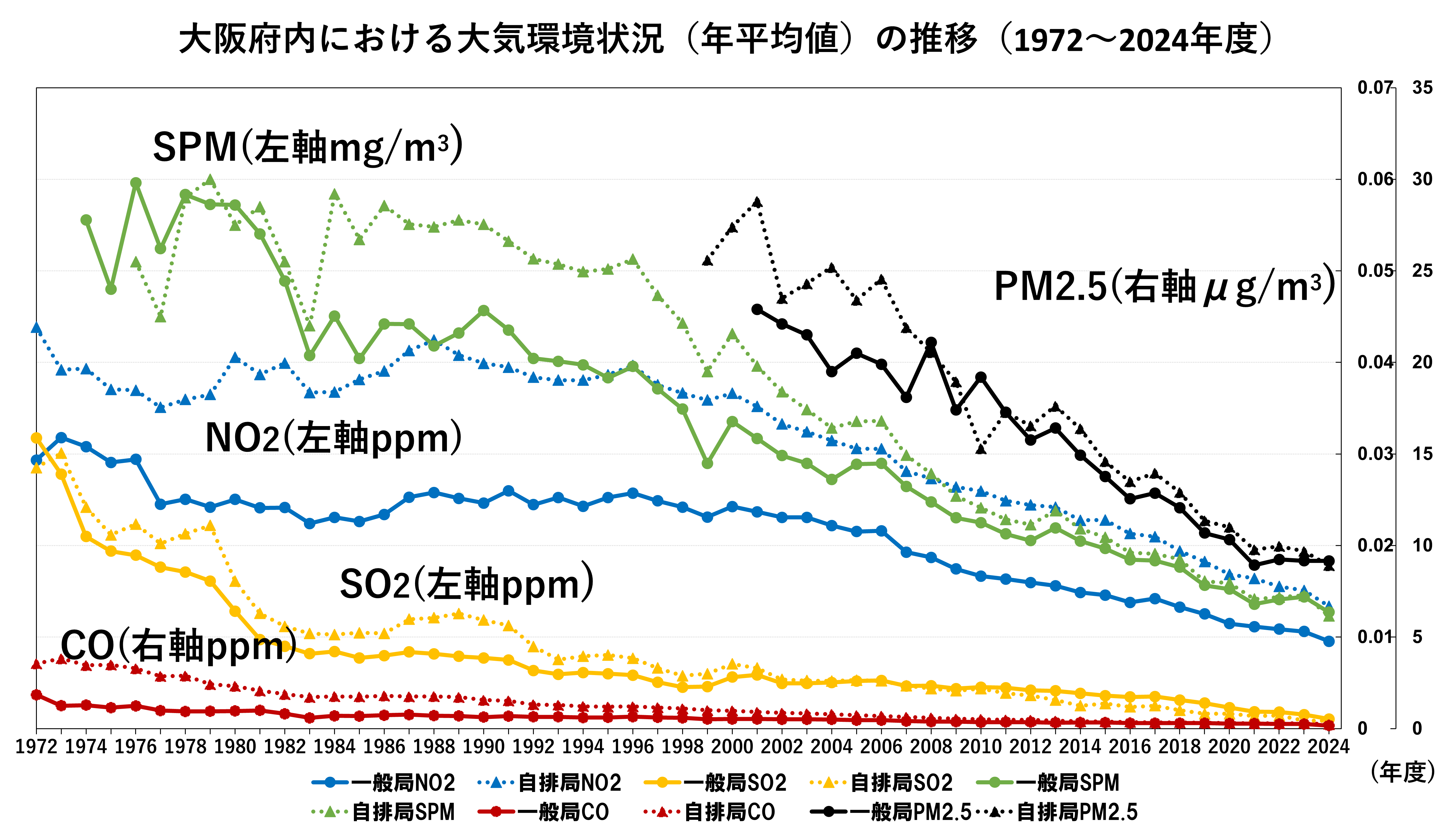 【参考】大阪府内における大気環境状況の推移(1972年度から2024年度まで)←New!! ダウンロード用データはこちら(PNG:710KB)